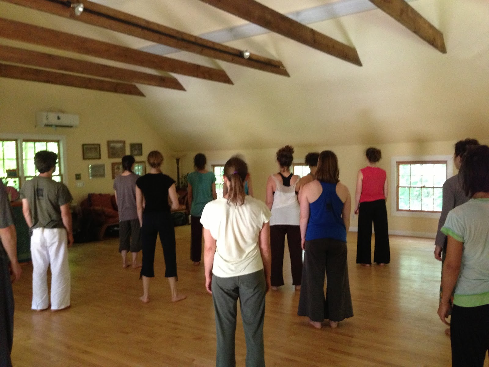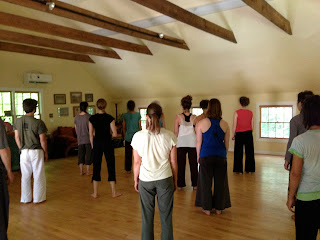 We had a modified jam/score as part of a CI workshop taught by Alicia Grayson and Tim O’Donnell that was organized by Jovanina Pagnano and held at Leslie Cohen Rubury’s Peaceable Barn in Redding, CT. Here is the group of 16 dancers in the final small dance. What a beautiful morning!
